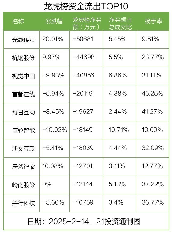 而龙虎榜中资金净流出最多的是光线传媒(300251.SZ),被净卖出为5.07亿元,占总成交金额的5.45%。光线传媒收盘上涨20.01%,换手率为9.81%。