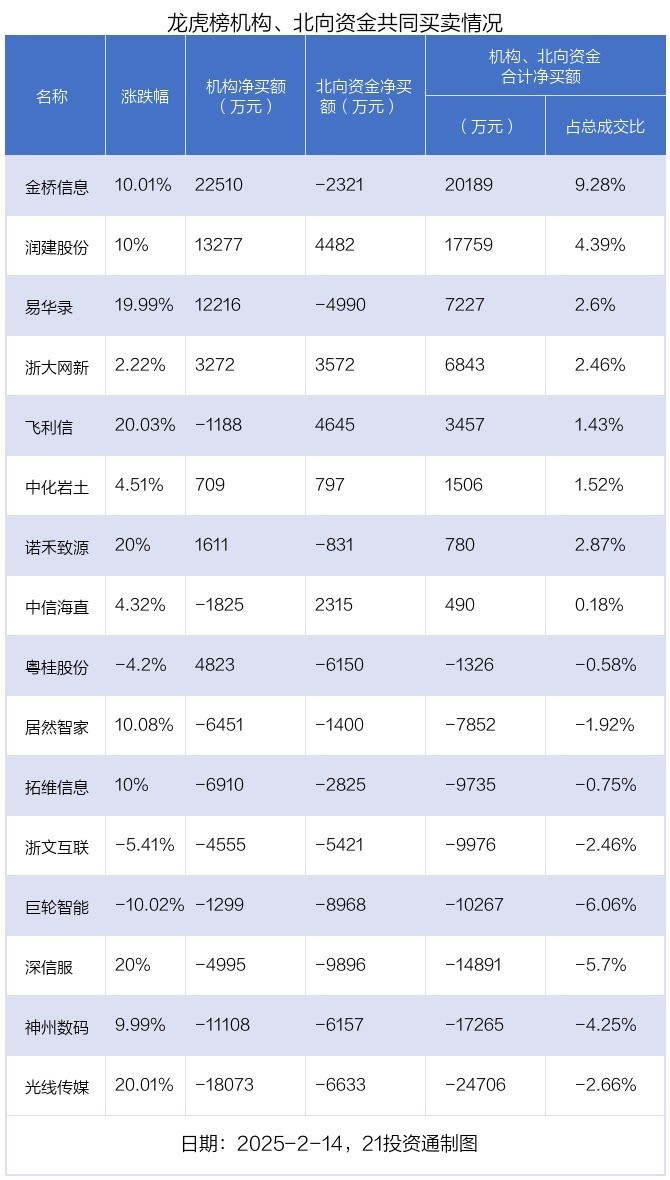 值得注意的是,机构和北向资金共同净买入了润建股份、浙大网新、中化岩土等3股;共同净卖出了居然智家、拓维信息、浙文互联、神州数码、光线传媒、巨轮智能、深信服等7股;在飞利信、中信海直、诺禾致源、金桥信息、易华录、粤桂股份上出现分歧,机构净卖出飞利信1188.06万元,北向资金净买入4644.85万元;机构净卖出中信海直1825.01万元,北向资金净买入2315.1万元;机构净买入诺禾致源1611.24万元,北向资金净卖出831.35万元;机构净买入金桥信息2.25亿元,北向资金净卖出2321.17万元;机构净买入易华录1.22亿元,北向资金净卖出4989.79万元;机构净买入粤桂股份4823.39万元,北向资金净卖出6149.64万元。