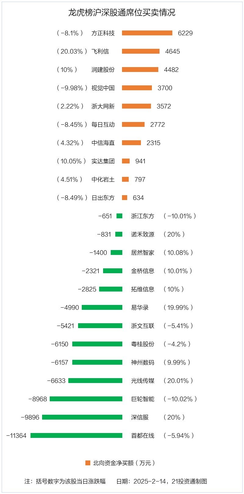 北向资金净买入10股,净卖出13股2月14日,北向资金参与龙虎榜中的个股共有23只,合计净卖出3.75亿元。其中沪股通净买入4股,净卖出4股,合计净买入2150.76万元;深股通净买入6股,净卖出9股,合计净卖出3.97亿元。