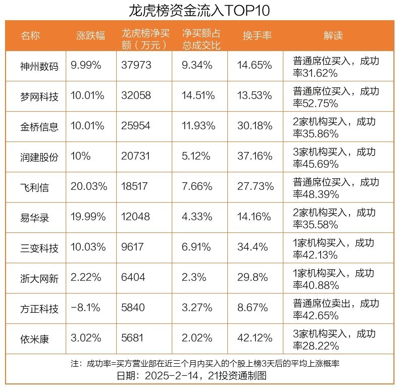 2月14日,上证指数上涨0.43%,深证成指上涨1.16%,创业板指上涨1.8%。盘后龙虎榜数据显示,共有58只个股因当日异动登上龙虎榜,资金净流入最多的是神州数码(000034.SZ),达3.8亿元。